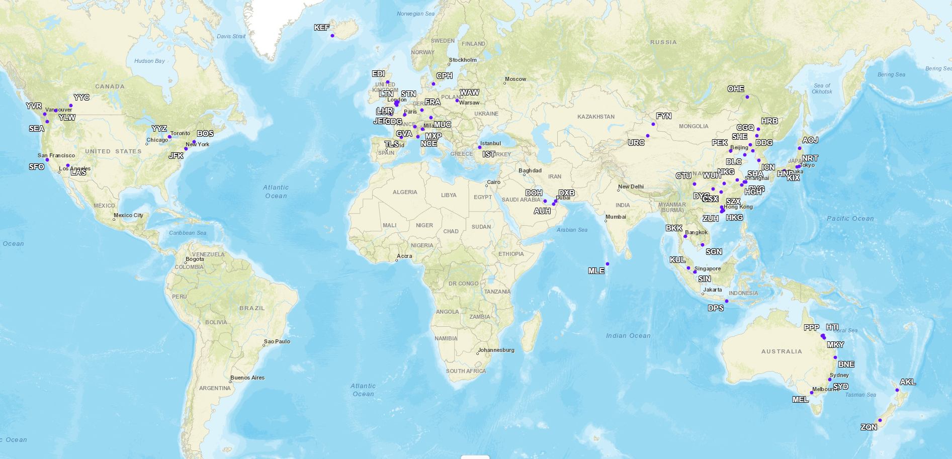 以下为我曾到访过的城市(以IATA机场代码标注),此地图使用GCmap工具制作。